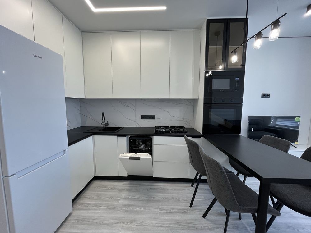 Квартира повністю облаштована — нові меблі та сучасна техніка( 2кондиціонера, духовка, посудомийна машинка, чайник, пилосос, телевізор, пральна машинка),продумане планування, вдале поєднання функціональності та стилю.