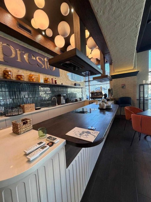 На первом уровне: открытая кухня, зоны кофейни и пекарни.