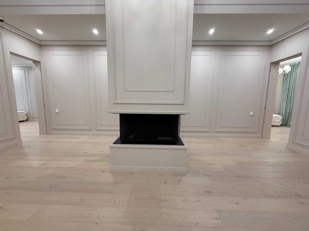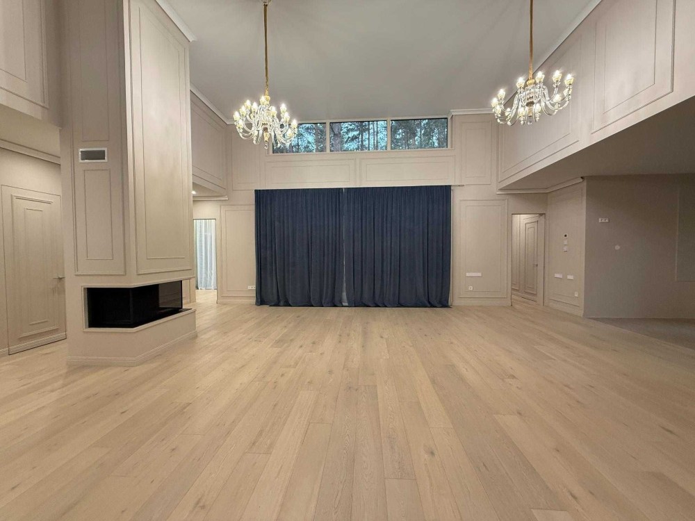 Віртуозний синтез сучасних стандартів приватності та класики сімейного спілкування. У серці заміського будинку у КМ Рів'єра Віледж під Києвом вітальня 77 кв.м. з біокаміном, вікнами під високою (понад 4 м) стелею та виходом-трансформером на величезну терасу. По периметру: