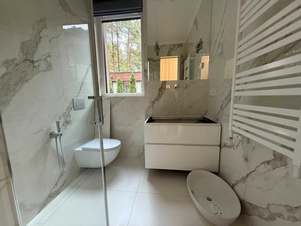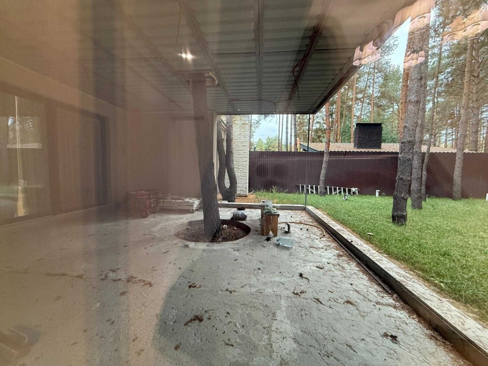 житловий простір розчиняється у сосновому лісі – встановлені великоформатні алюмінієві склопакети з УФ-захистом та шумопоглинанням; у спальнях штори блекаут;