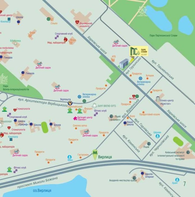 Поряд з будинками одразу парк, чисте повітря, дитячий садок, школа, магазини.