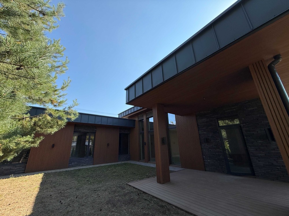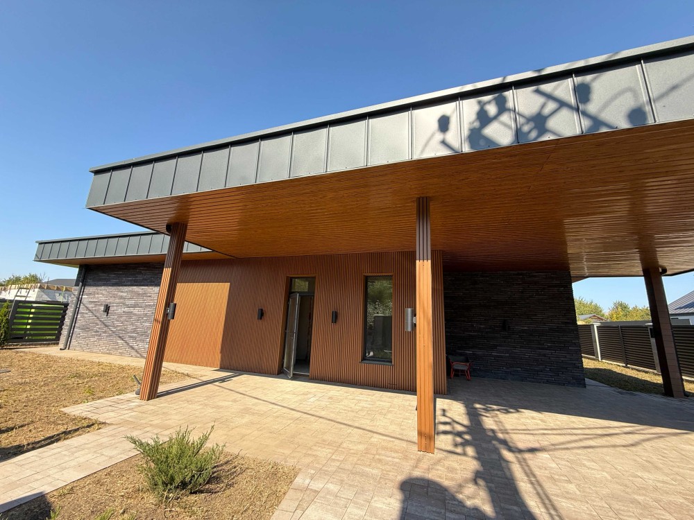 Фасад - клінкерна цегла ДПК рейка , яка імітує дерево, але не потребує обробки