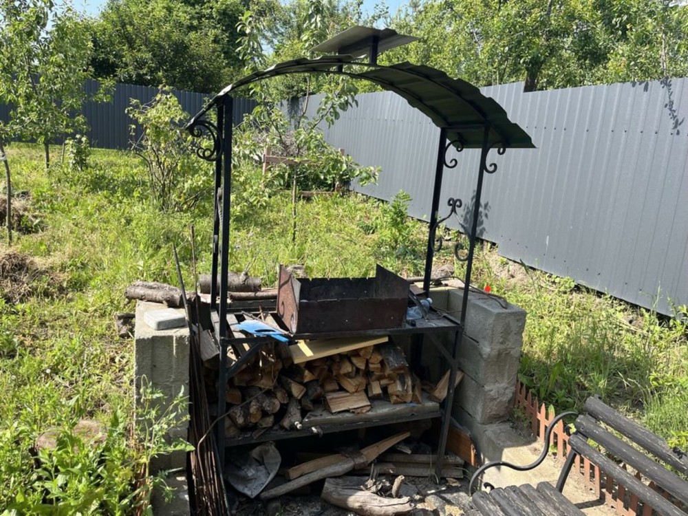 Простора ділянка з місцем для городу, молодим фруктовим садом, смородиною та декоративними квітами.