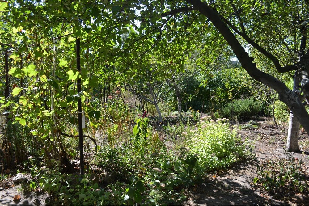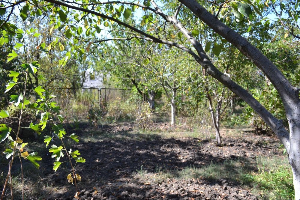 сад з плодовими деревами та скважина.