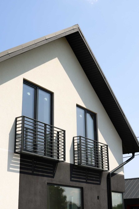 Вікна: Rehau EURO 70 з теплим монтажем. Панорамні вікна першого поверху - алюмінієві конструкції вітражі з утепленням примикань, зроблені за індивідуальним замовленням, виглядають престижно і стильно.