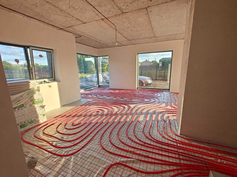 Укладено теплу підлогу по всьому першому поверсі, у спальнях другого поверху встановлені плоскі радіатори, в решті приміщень другого поверху прокладено контури системи теплої підлоги, які працюватимуть від контуру через розподільники тепла.