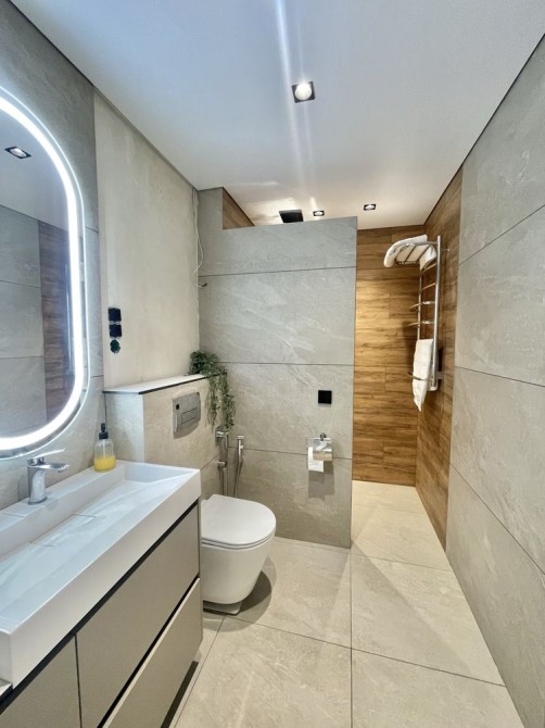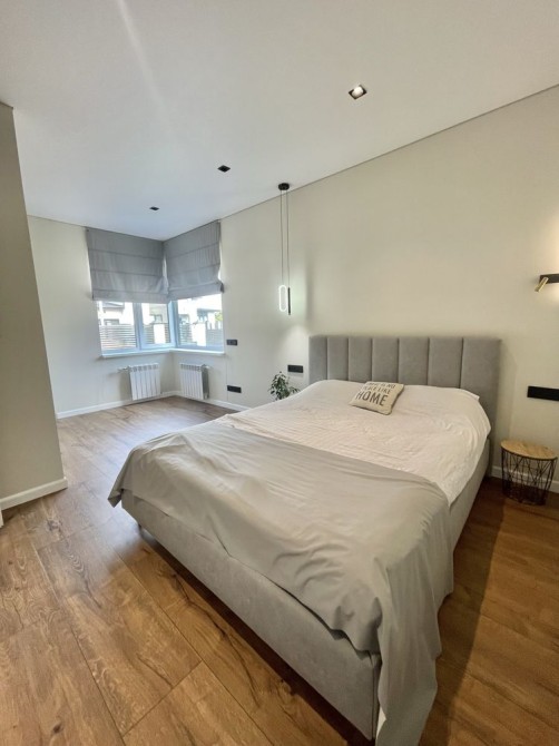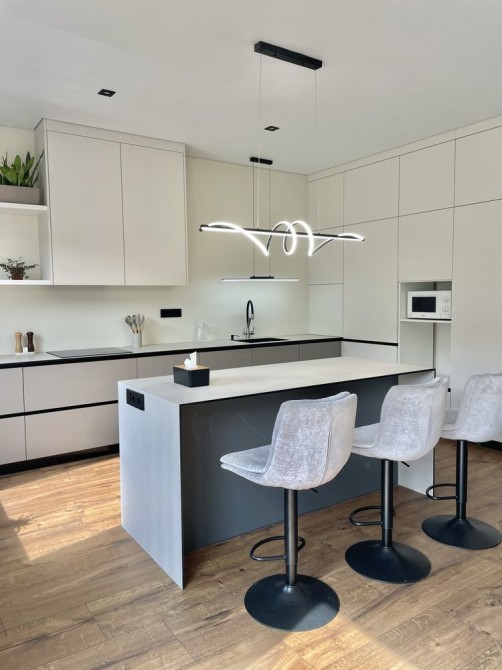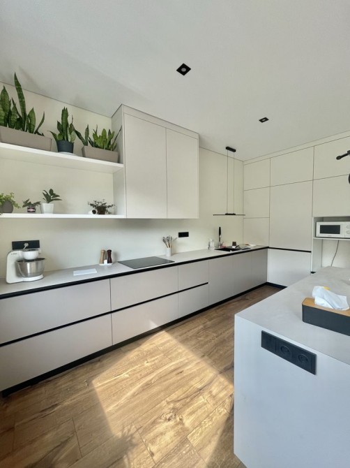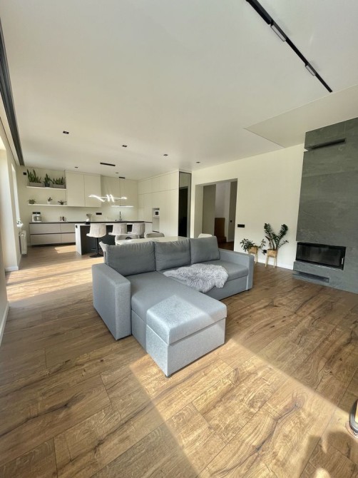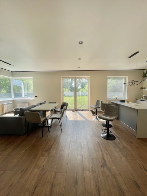 В середині зроблені такі роботи: на першому поверсі виконано ремонт та встановлено меблі та техніку Whirpool, прокладена тепла підлога, розведене опалення, яке під'єднане до електрокотлу, також є камін, який опалює всі житлові кімнати та кухню-студію, може використовуватися як альтернативне джерело опалення. На підлозі в якості чистового покриття використано SPC-ламінат єдиним контуром по всьому поверсі, який чудово проводить тепло, приємний на дотик. Кухня зпроектована по індивідуальному проекту, стільниця з HPL пластику, раковина вмонтована під неї, що дуже зручно для прибирання, в кухню вбудовано комору. Є великий острів. Простора кухня-вітальня 45 кв.м, має панорамний вихід на терасу.