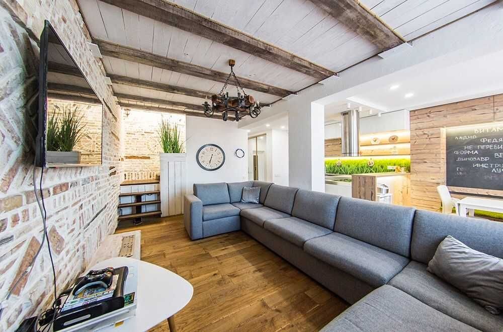 Ремонт виконаний за індивідуальним дизайнерським проектом, з використанням екологічних матеріалів, підлога - натуральне дерево, стіни - цегла під лофт і зруб.