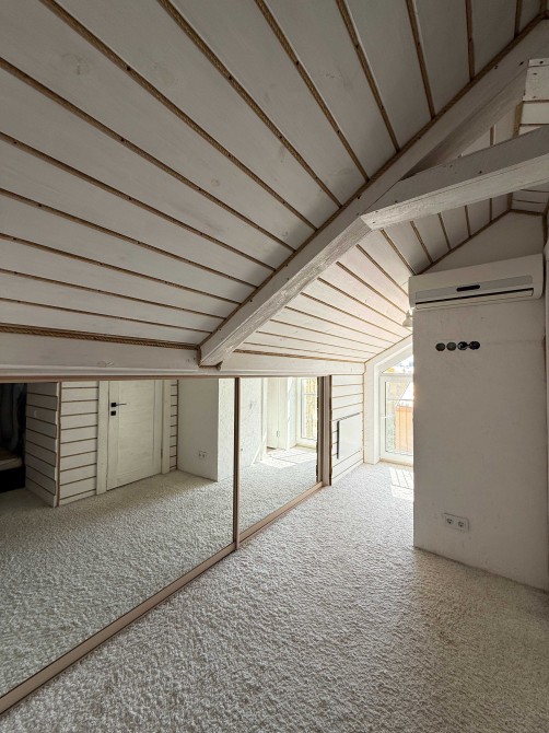 Третій рівень – мансарда з ще одним двоспальним ліжком, комора-гардероб під скошеним дахом, третій санвузол з дальньою коморою.