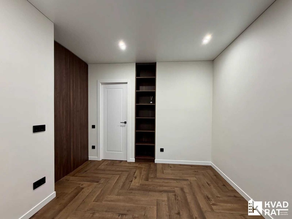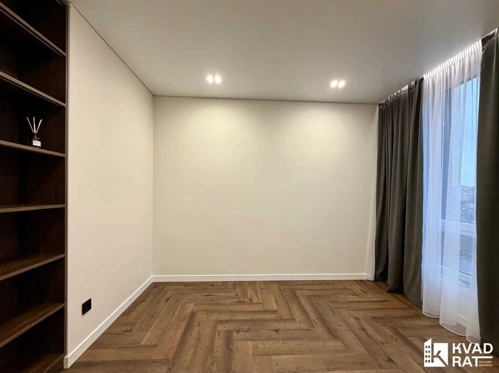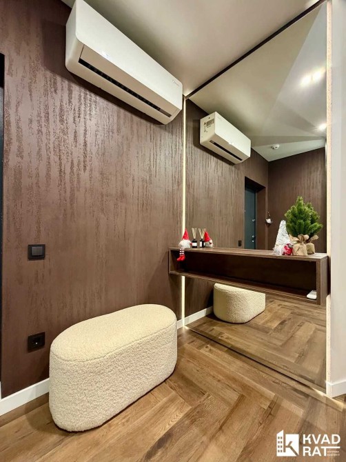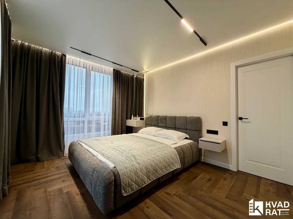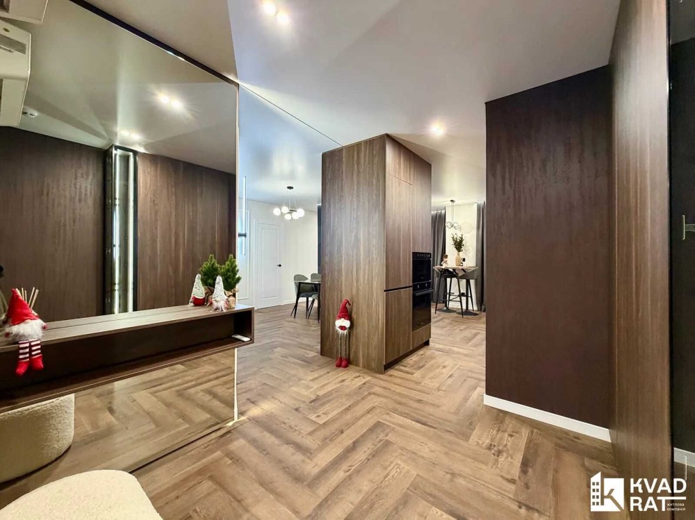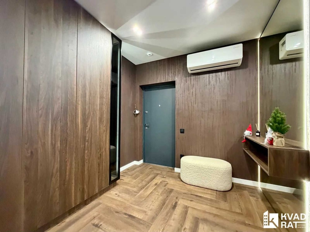 Кухня-студія 40м2 із відпочинковою зоною, обідня зона та барна стійка. Окрема спальня кімната із гардеробною та великими двома вікнами. Друга кімната не укомплектована, можна зробити дитячу чи кабінет, також є вбудована шафа. Суміжний санвузол із ванною. Простора вхідна зона із великим дзеркалом, вбудованою шафою та кондиціонером.
