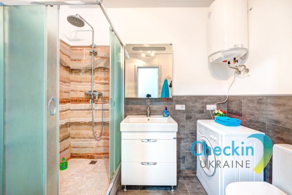 В компактной ванной комнате имеется душевая кабина, умывальник, стильная машина, небольшой шкафчик для личных вещей. Для бесперебойной подачи горячей воды установлен бойлер.