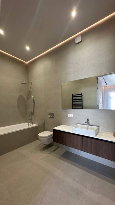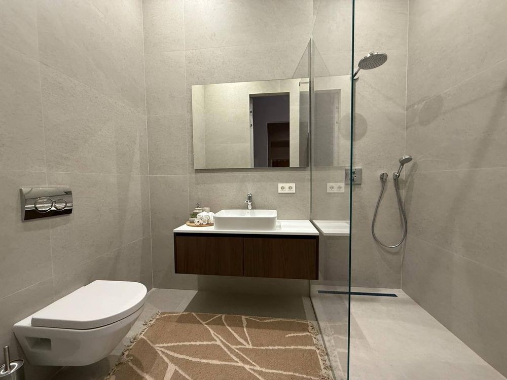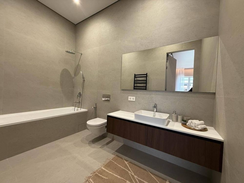 Зручне планування: простора кухня-вітальня ~40 м² з виходом на терасу, кухня з островом і технікою, дві майстер-спальні, гостьова кімната, ванна, гостьовий санвузол, технічне приміщення з виходом до критих паркомісць.