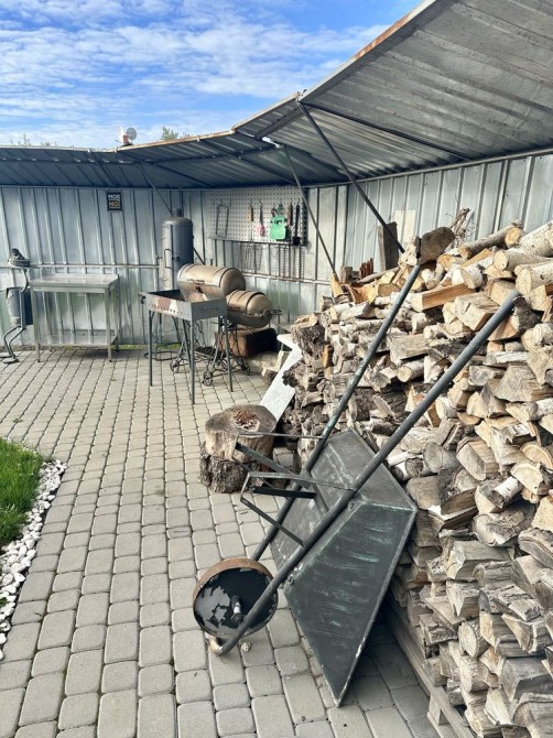 крытый навес с автоматическими воротами для заезда 1 машины ( удобно заряжать электрокар). Рулонная газонная трава, садовая мебель под навесом, мангальная зона, дрова, и кладовая 2м2 для хранения техники и материалов по уходу за территорией. Видеонаблюдение.
