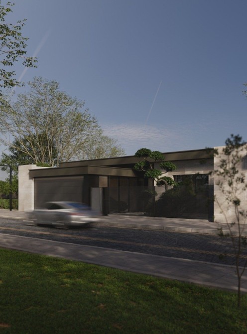 Фасад комбинированный: травертин, декоративная штукатурка