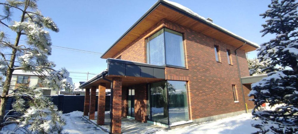 ​Эстетика фасада: Облицовка отборным керамическим кирпичом в сочетании с элементами из дорогой термодоски на террасе и карнизах.