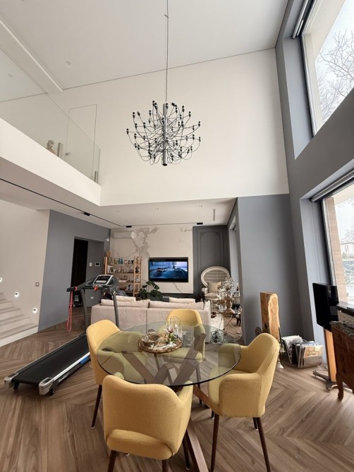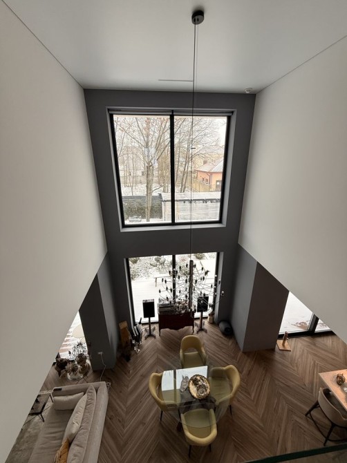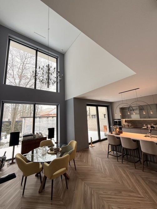 Первый этаж: входная группа, просторная кухня, совмещенная с гостиной, выход на террасу, топочная, гостевой санузел с постирочной зоной. Высота потолков 3м.