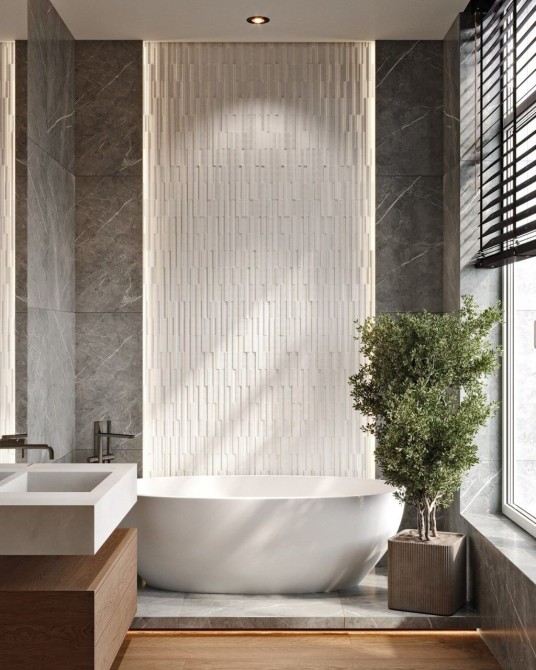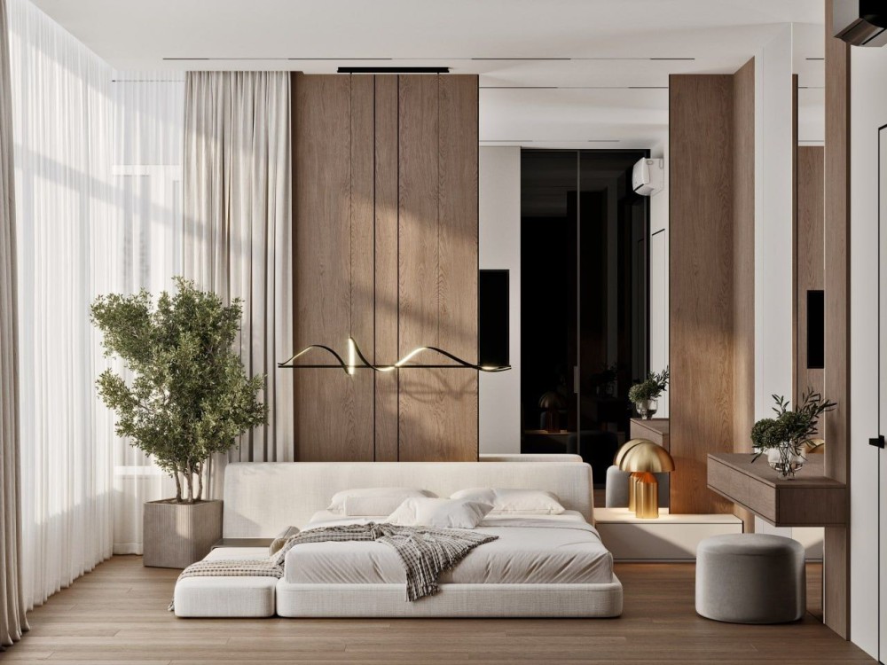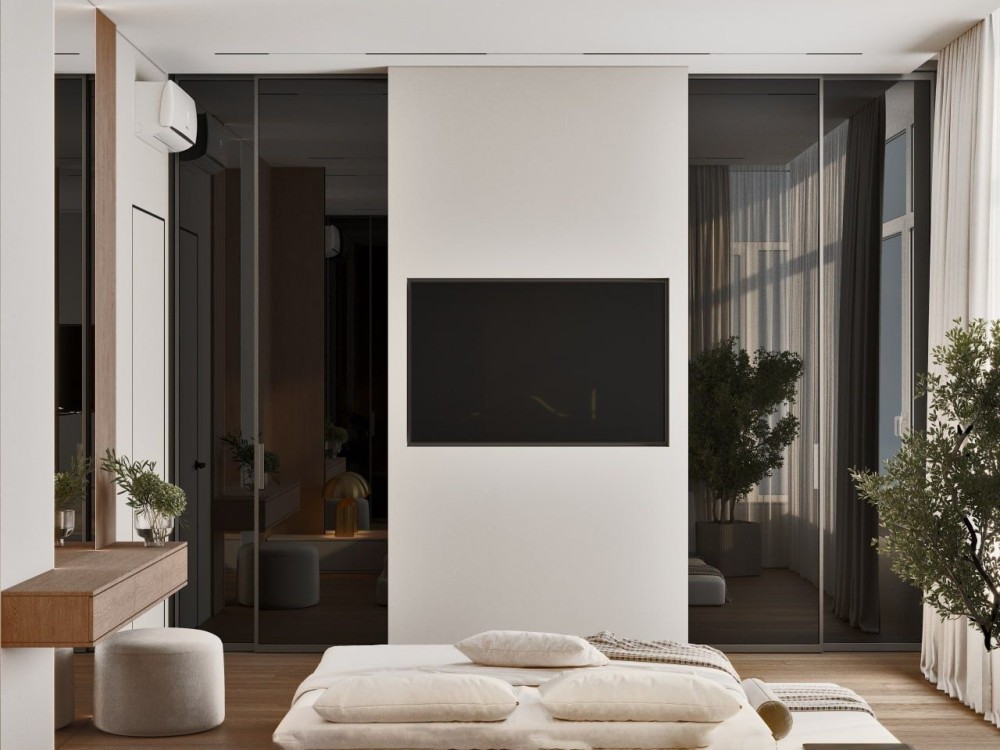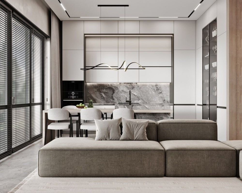 Высокие потолки, большие панорамные окна.