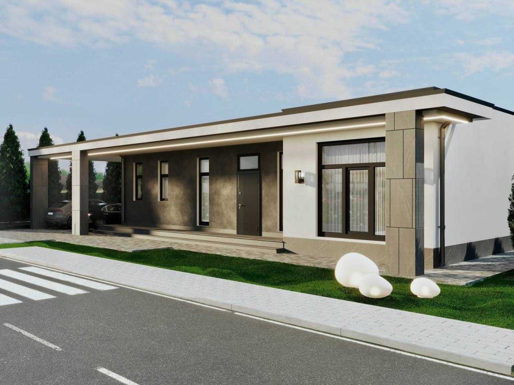 Фасад широкоформатный кекомогранит, декоративная штукатурка.
