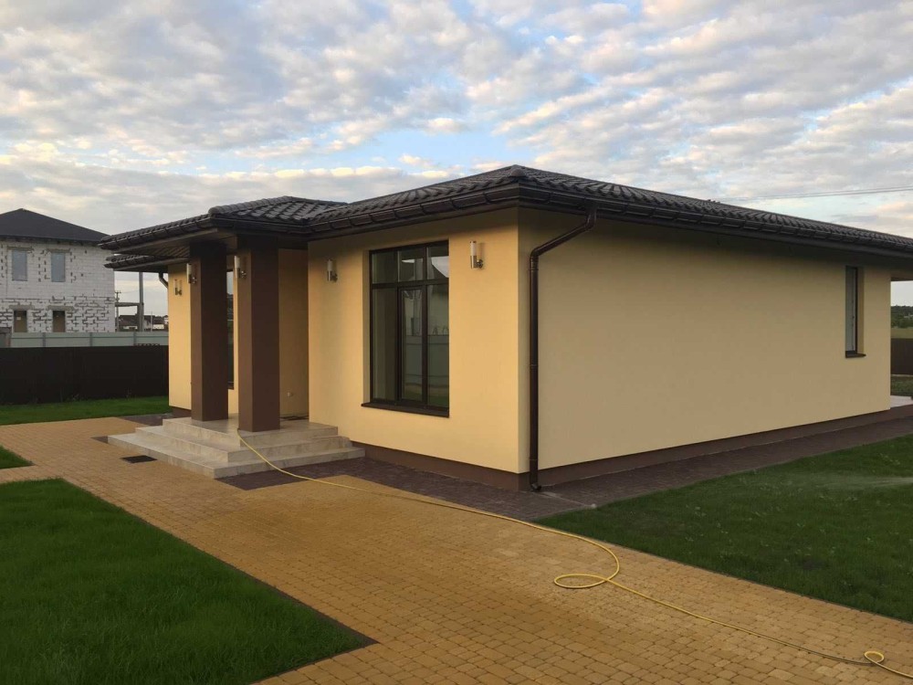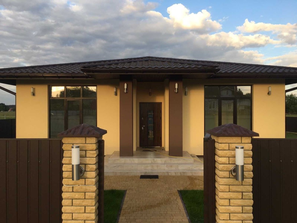 Іспанська плитка колір білий мармур по всьому периметру будинку і декоративна штукатурка на стінах.