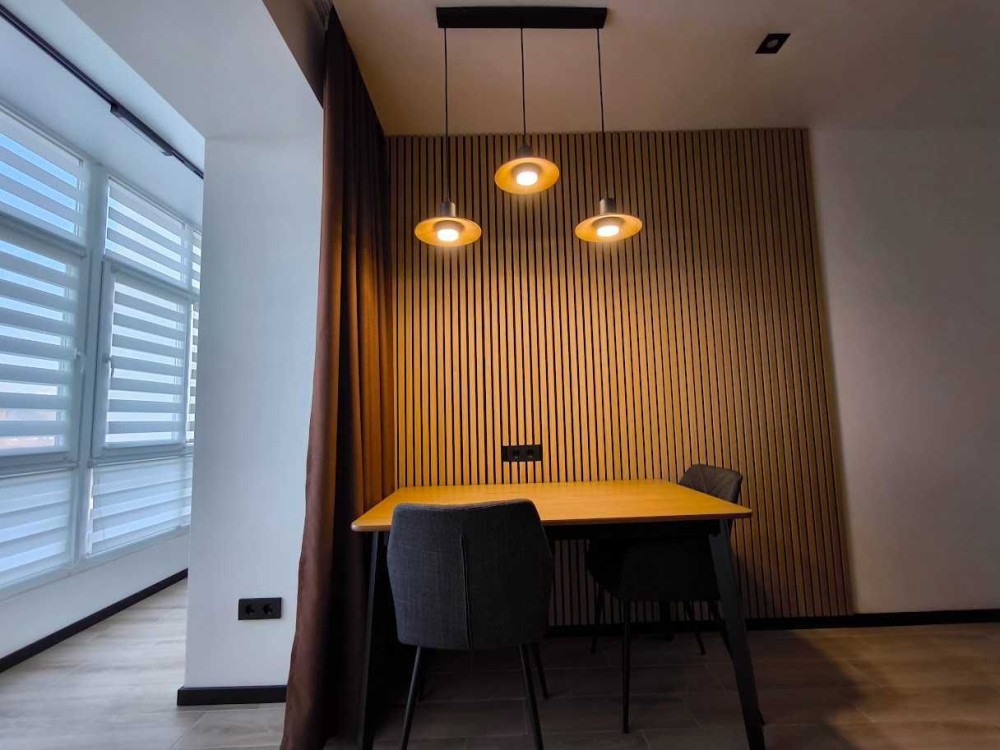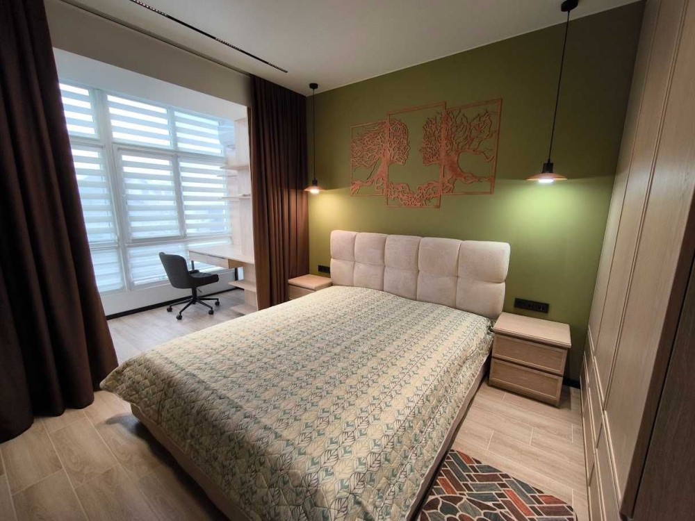 Вся необхідна побутова техніка. Зручне двоспальне ліжко на ортопедичній основі з підйомним механізмом, розкладний диван, велика шафа в кімнаті та прихожій, офісне крісло та стіл для роботи та/або навчання.