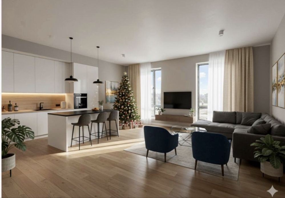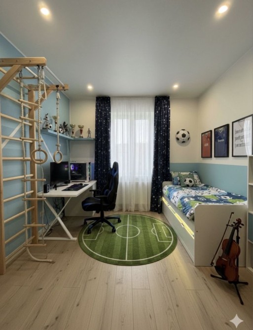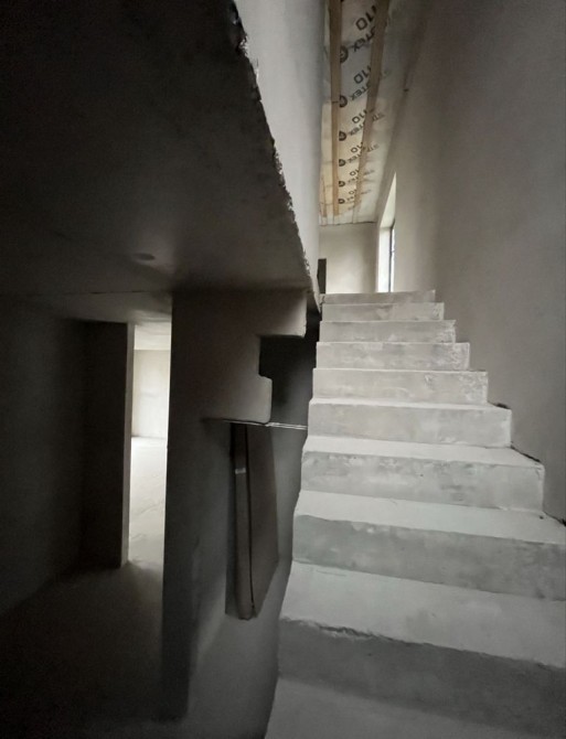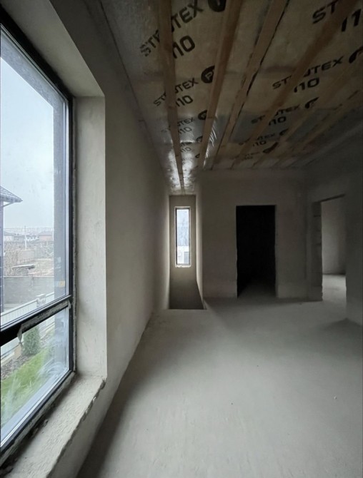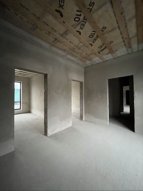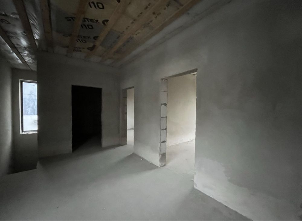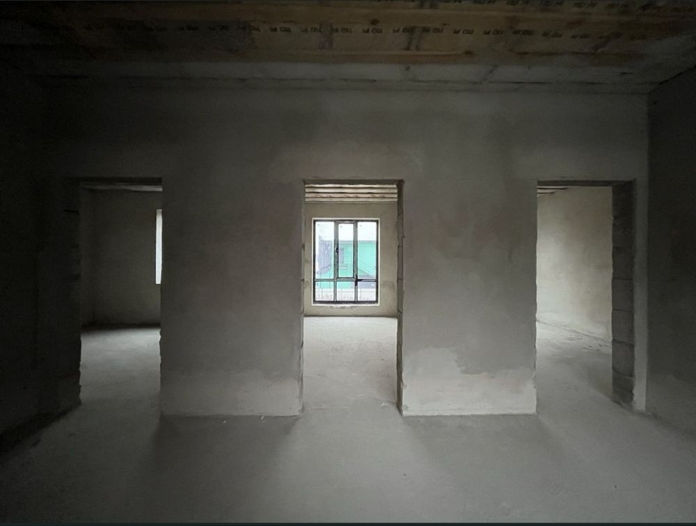 На другому — три спальні, гардеробна, санвузол і просторий хол. Усередині виконані стяжка та штукатурка — можна одразу починати чистовий ремонт.