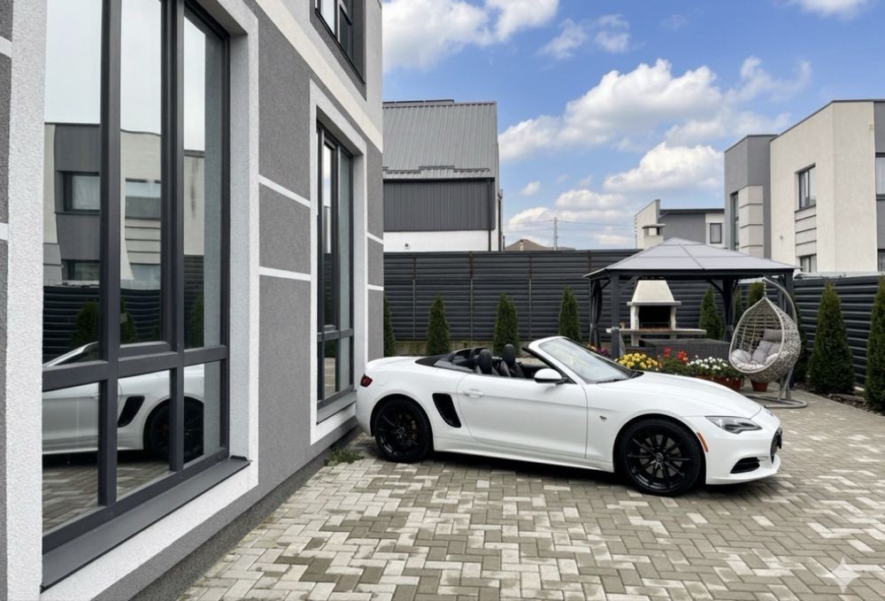 Закрита доглянута територія з бруківкою, газоном та зеленими насадженнями. Є місце для авто, тераси або зони барбекю.