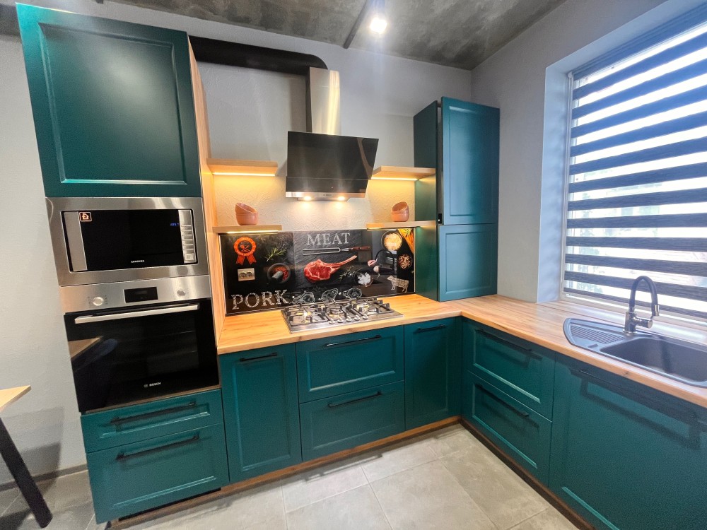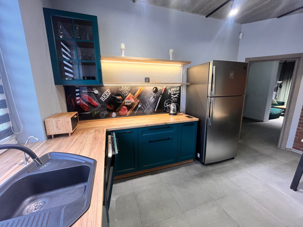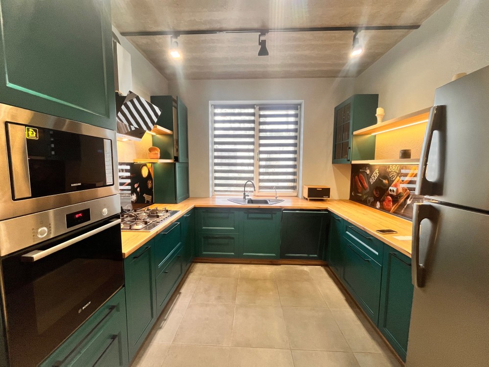 -повністю обладнана кухня/столова (якісні, дорогі фасади на доводчиках Blum, вбудована техніка);