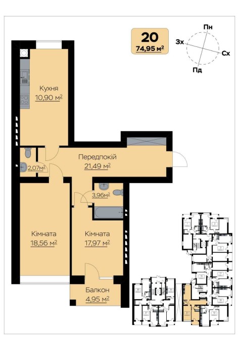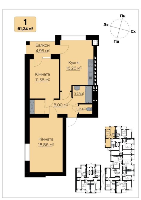 Площа квартир від 61,24 м² до 84,28 м² із можливістю вибору планування.