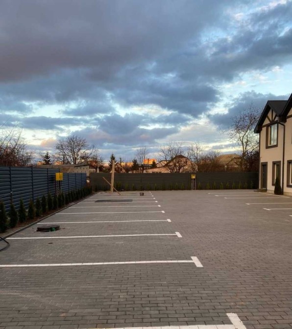 Перед будинком — організовані паркомісця, позаду — індивідуальний огороджений двір.