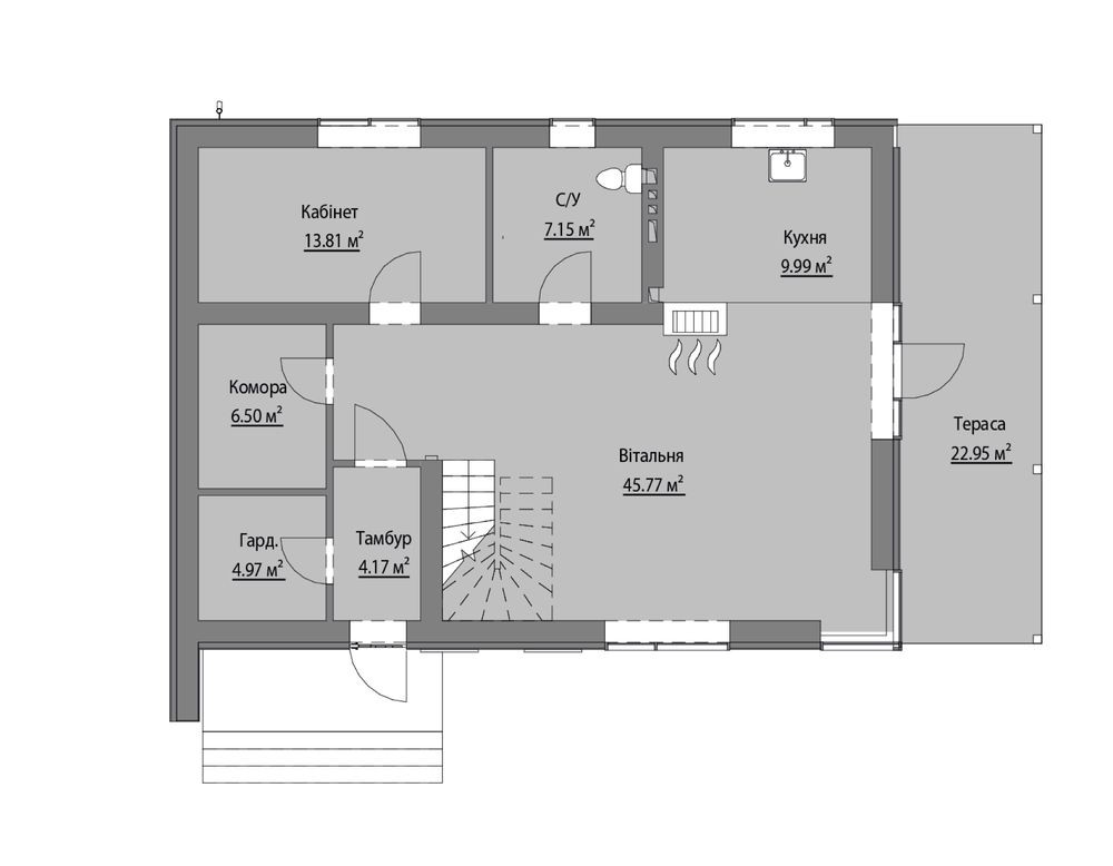 У плануванні передбачено 3 окремі спальні, просторий кабінет для комфортної роботи з дому, гардеробна, комора, а також величезна вітальня 45,77 м2 для родинного відпочинку й окрема кухня 10 м2 для зручного приготування їжі.