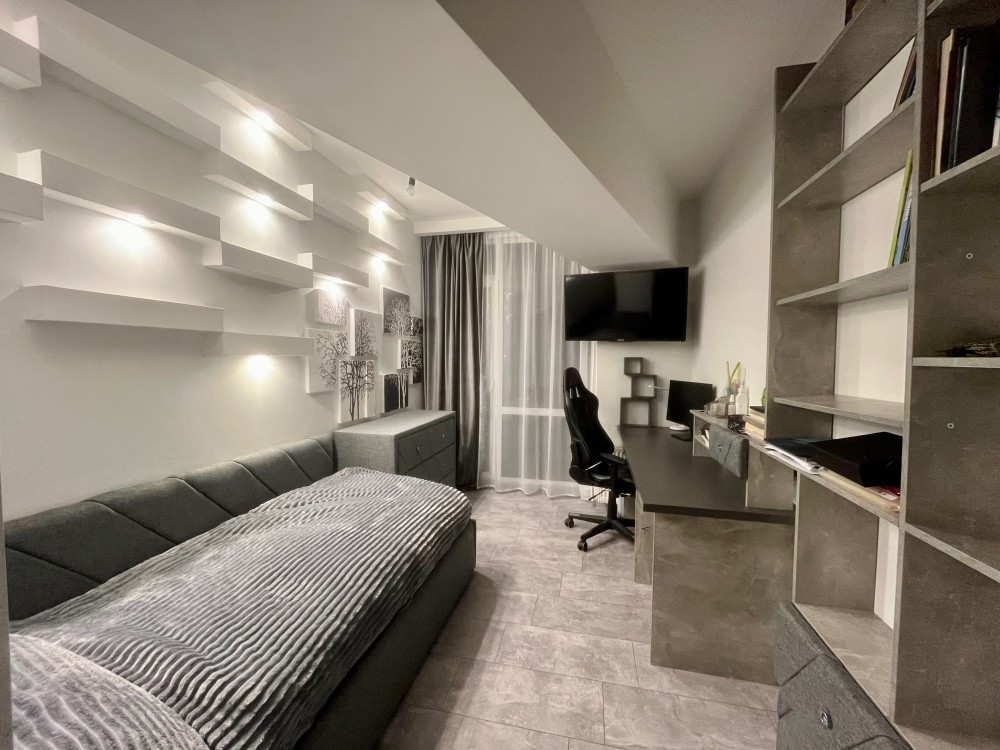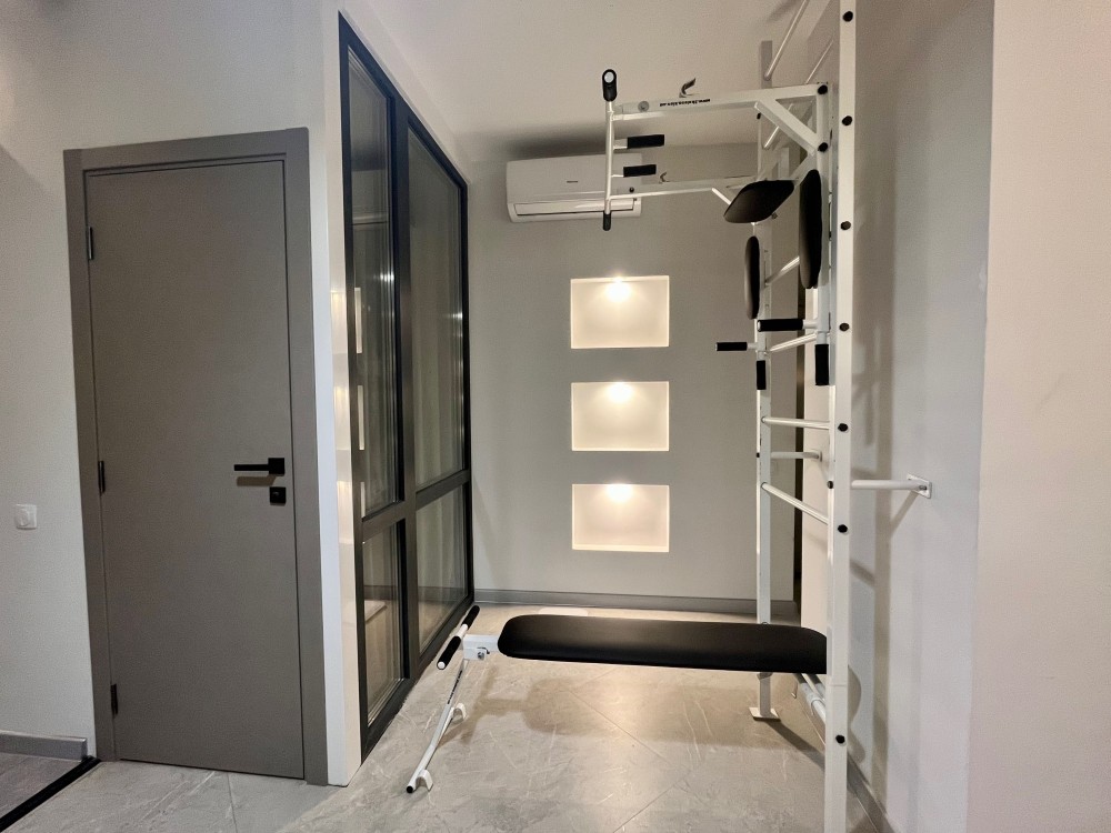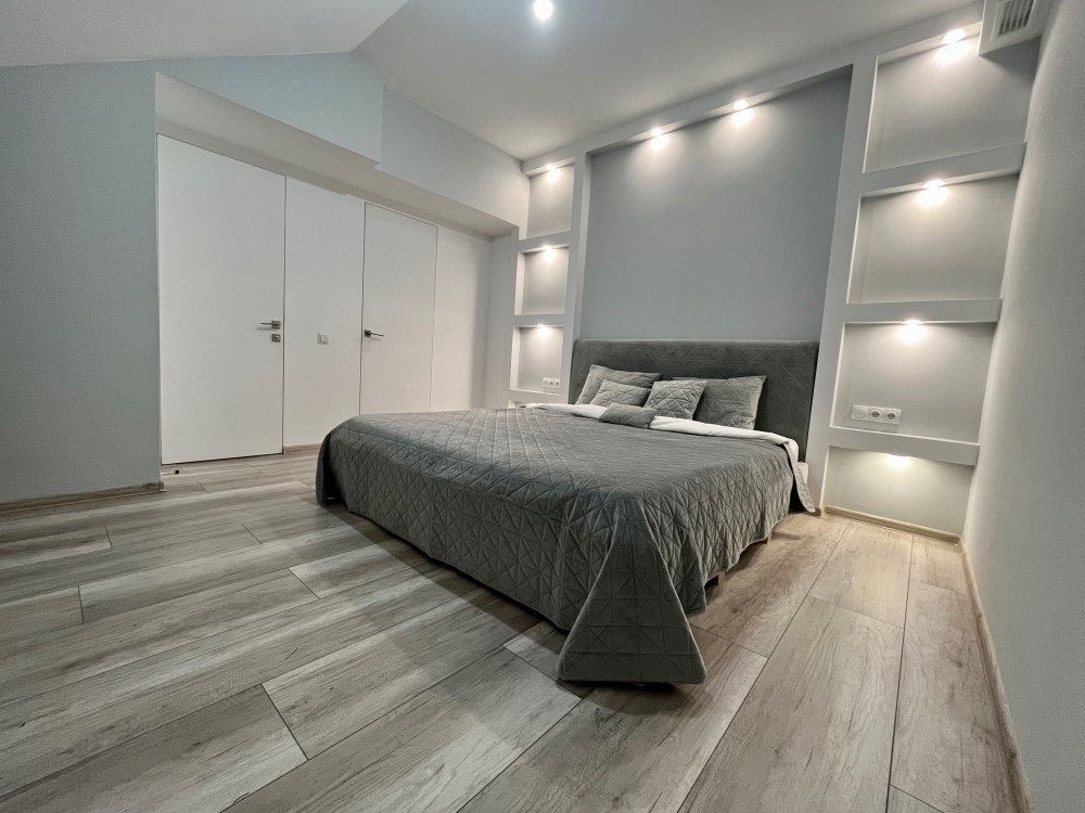 2 майстер-спальні з санвузлами та гардеробом, кабінет, кухня із їдальнею, спортивна зона, вітальня (1 спальня та вітальня- «за трьома стінами», 2 виходи з квартири на 5 та 6 поверхи)