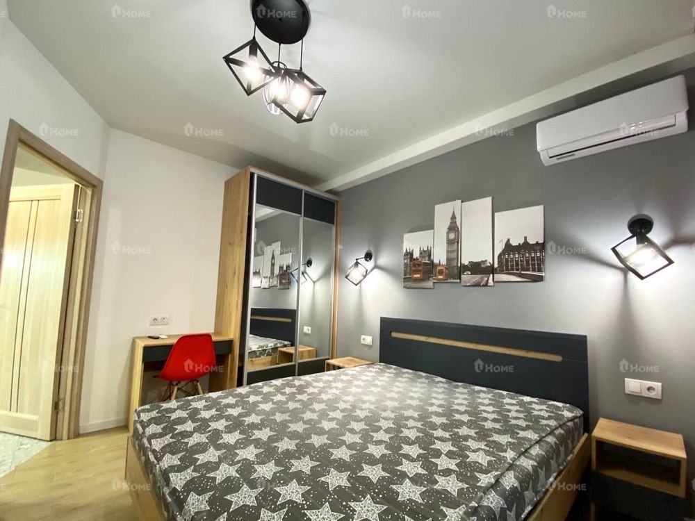 В первой спальне расположена двуспальная кровать с ортопедическим матрасом, прикроватные тумбочки, Смарт-ТВ, кондиционер, шкаф-купе и рабочий столик.