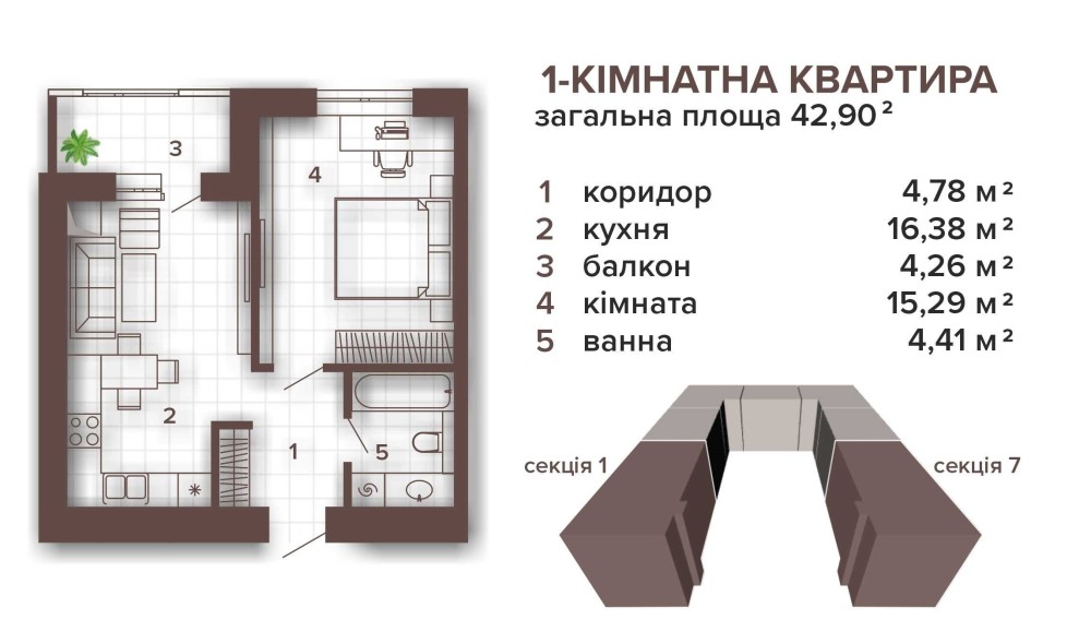 • Загальна площа 42 м2