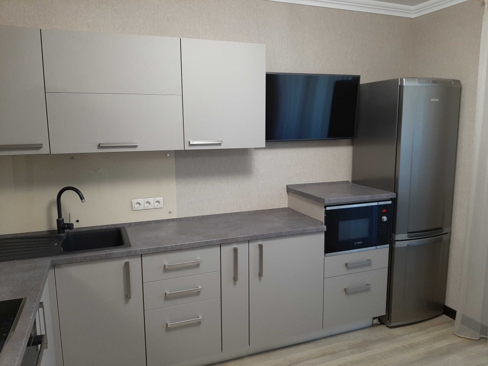 На кухні: холодильник, плита, духова шафа, витяжка, мікрохвильова піч та необхідні кухонні меблі.