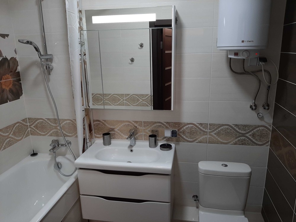 Санвузол: бойлер, пральна машина, навісні шафа з дзеркалом та тумба з умивальником, а також французька сантехніка - чавунна ванна, унітаз та змішувачі.
