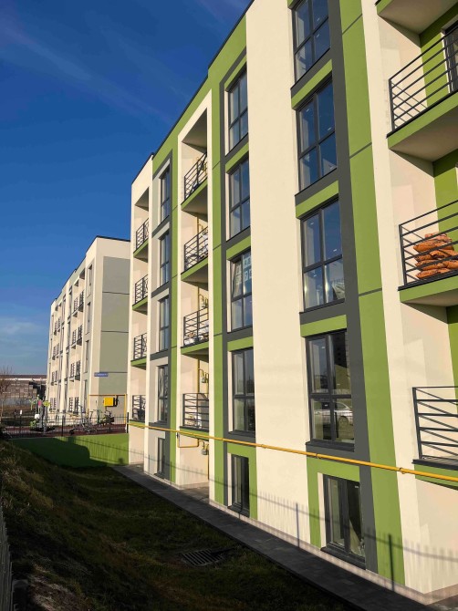 Комплектація: піщано-цементна штукатурка стін, лазерна стяжка підлоги, комунікації заведені в квартиру, якісні вікна та вхідні двері.