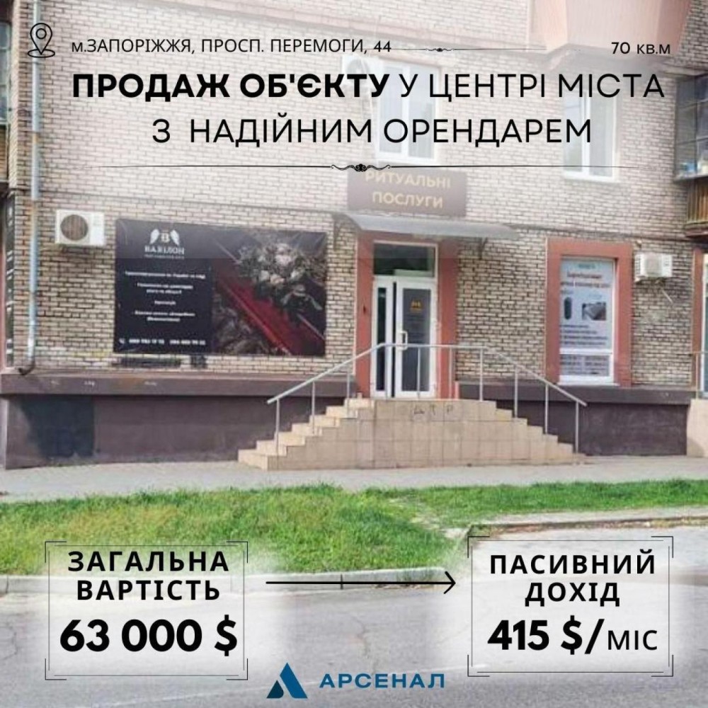 Готовий бізнес у центрі: Фасадне приміщення 70 м² на вул. ПеремогиШукаєте надійний актив у самому затребуваному районі міста? Пропонуємо до придбання нежитлове приміщення за адресою: вул. Перемоги, 44. Це локація, яка працює на ваш прибуток з першого дня.ЛОКАЦІЯ — ЕПІЦЕНТР ТРАФІКУ ТА ВІДПОЧИНКУ:* Транспортний вузол: Об'єкт розташований поруч із зупинкою «Бульвар Шевченка» — однією з ключових точок Вознесенівського району.* Потік клієнтів: Сусідство з Парком Трудової слави, міською лікарнею №10 та школою №58 забезпечує постійний приплив різних категорій клієнтів протягом усього тижня.* Ділове оточення: Район насичений офісами великих компаній, банківськими відділеннями та популярними магазинами.ТЕХНІЧНІ ХАРАКТЕРИСТИКИ ТА ОСНАЩЕННЯ:* Площа: 70 м² — ідеальний формат для ритейлу, аптеки чи сфери послуг.* Фасад: Окремий вхід та великі вітрини з виходом на вул. Перемоги забезпечують максимальну видимість.* Комунікації: Заведена потужність 5 кВт, встановлено кондиціонер для комфортної роботи.* Безпека: Об'єкт під наглядом — встановлено сучасну охоронну сигналізацію.ІНВЕСТИЦІЙНІ ПЕРЕВАГИ:- Діючий дохід: Можливий продаж із надійним орендарем, що дозволяє вам стати власником працюючого бізнес-кейсу.- Універсальність: Приміщення легко адаптується під будь-який вид діяльності — від кав'ярні до медичного кабінету.- Ліквідність: Нерухомість на вул. Перемоги завжди має високий попит на ринку оренди та продажу.Інвестуйте в квадратні метри, які завжди в центрі подій Запоріжжя!Телефонуйте сьогодні, щоб отримати детальну інформацію про окупність об'єкта та домовитися про перегляд.