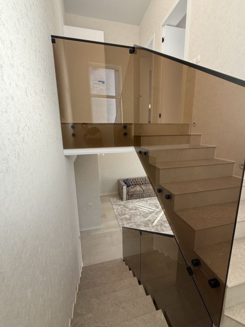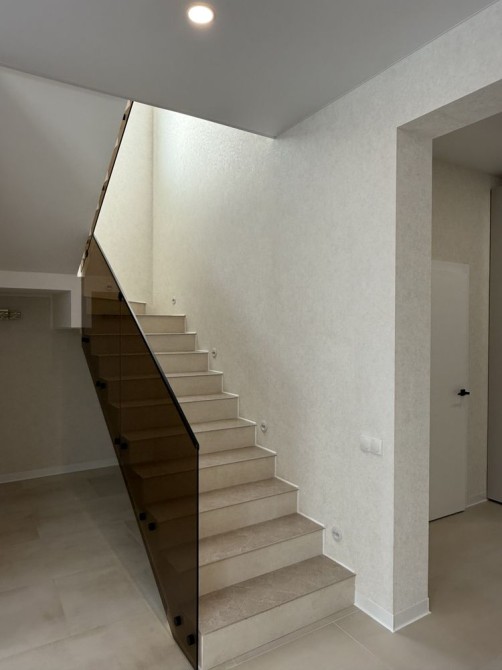 • на сходах встановлено точкові світильники та підвісну люстру, скляні перила бронзового кольору.
