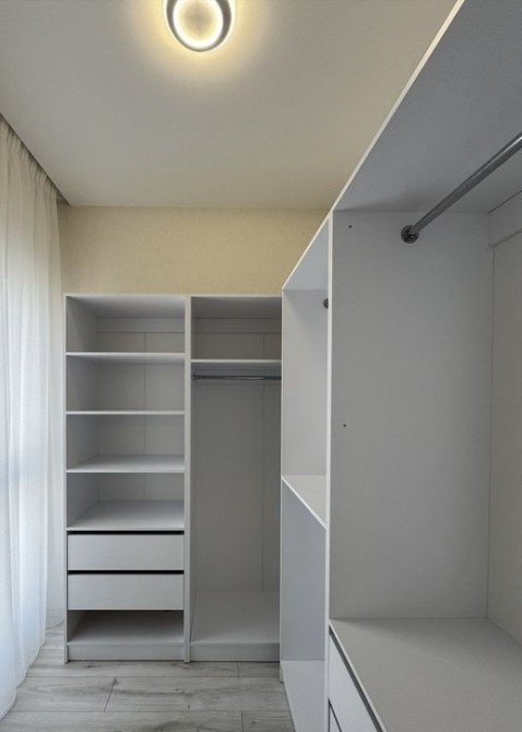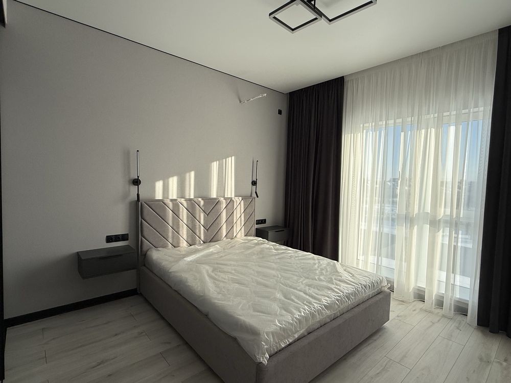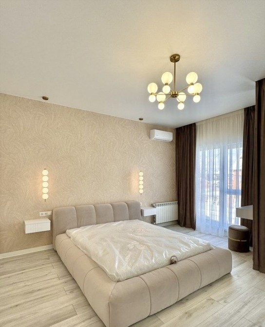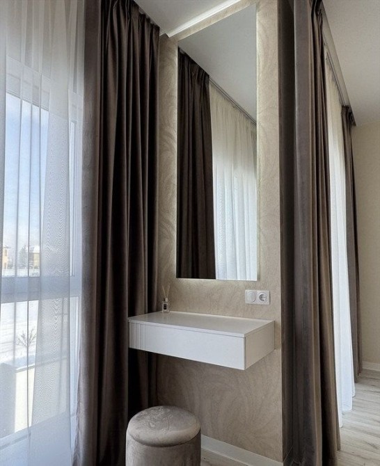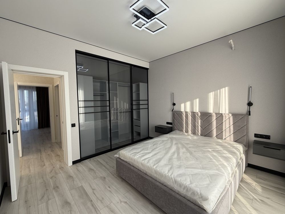 • майстер-спальня: двоспальне ліжко 160*200, приліжкові підвісні тумби, підвісний мейк-ап столик із високим дзеркалом з підсвіткою. Приліжкові бра та люстра, мебльований гардероб із штангами, шухлядами та полицями для речей.