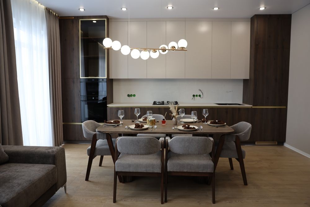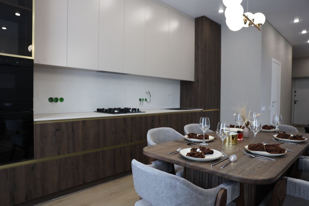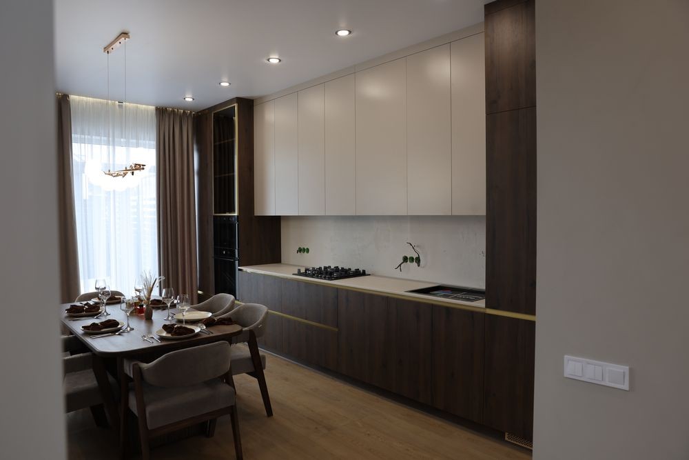 • Кухня з вбудованою технікою (широкий холодильник 70 см, посудомийна машина, духова та мікрохвильова піч, газова поверхня)