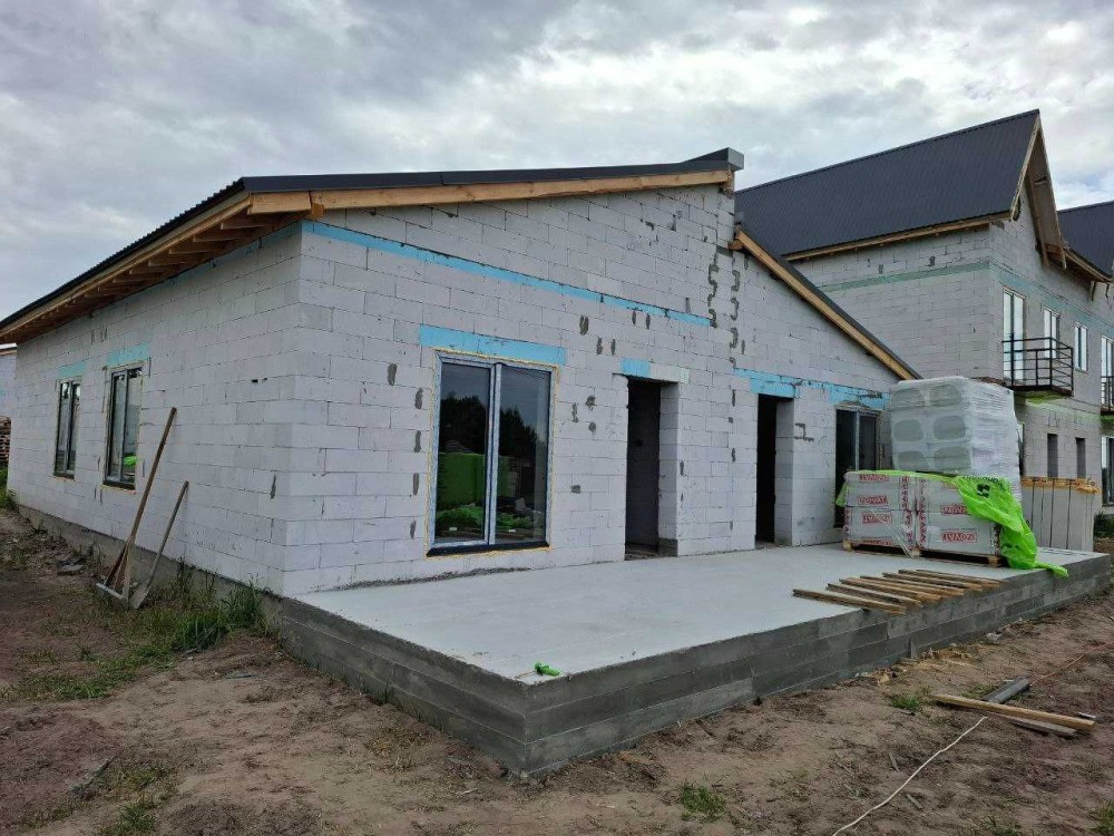 - Характеристики будівництва: стрічковий фундамент, несучі стіни газоблок 300 мм, утеплення пінопластом ПСБ-С-35 на 100 мм. Декоративна штукатурка і якісне фарбування.