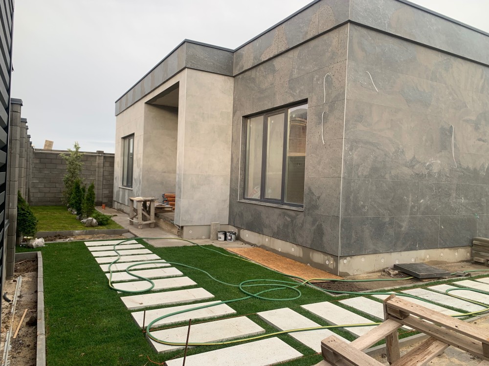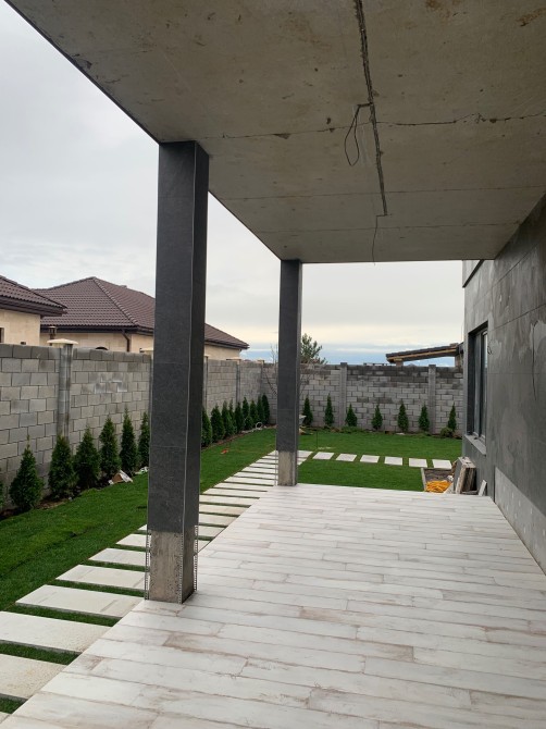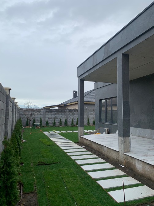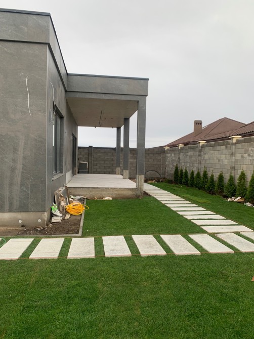 В дворі : газон + туї, тротуарна плитка.