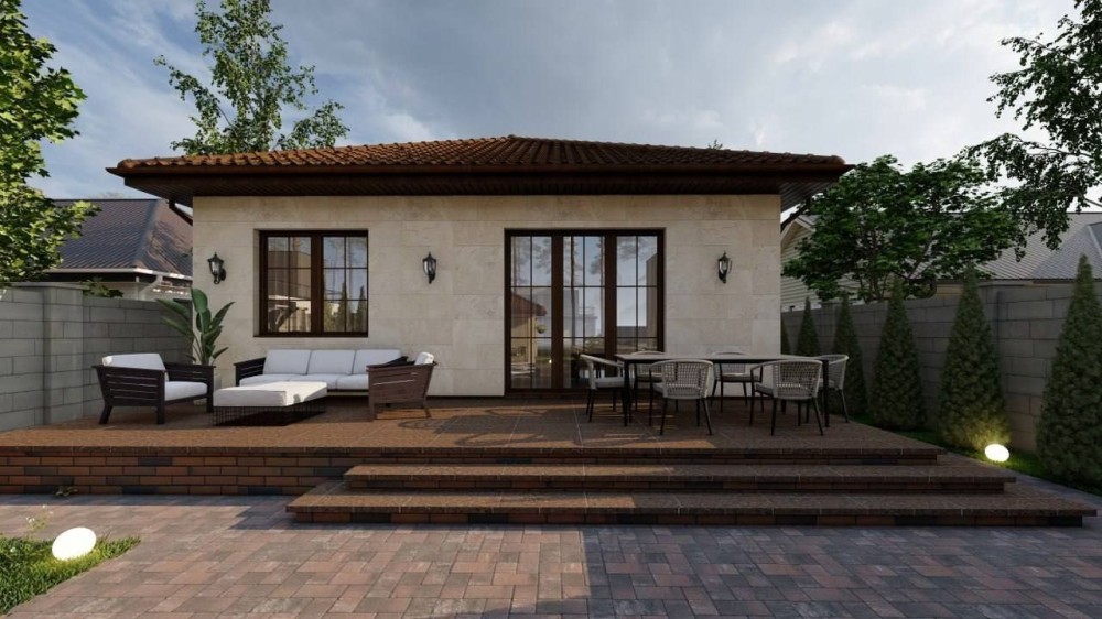 Фасад: травертин + декоративная штукатурка