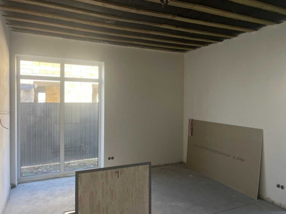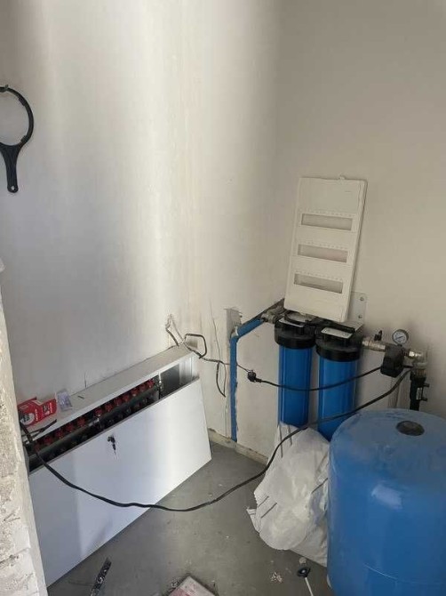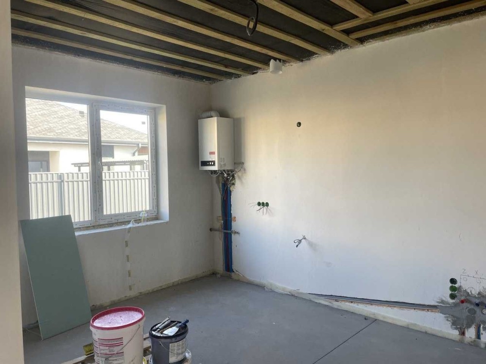 Виконано якісну чистову стяжку з розведенням теплої підлоги, зроблена електрика та сантехніка, стіни оштукатурені. У санвузлах встановлені інсталяції. Газ заведений у будинок, вже встановлений котел — система опалення готова.