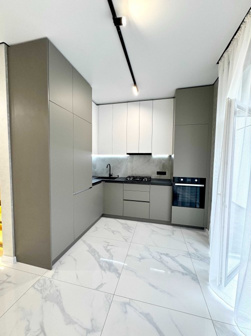 Кухня укомплектована меблями та технікою: вмонтований холодильник, посудомийна машина, варильна поверхня, духова шафа.