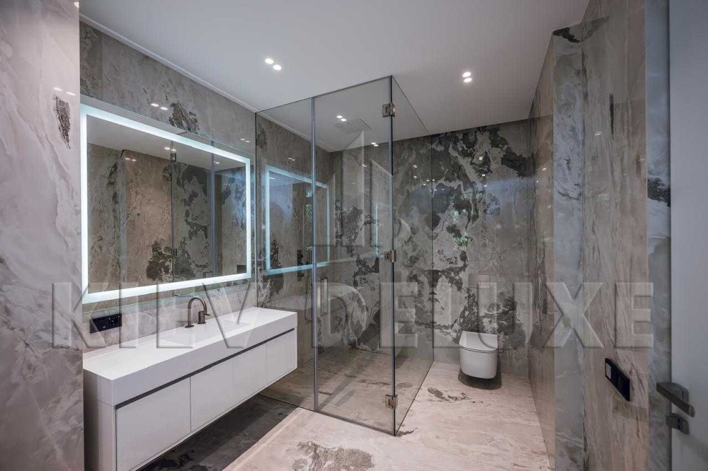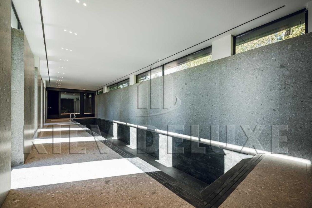 В інтерєрі використано широкоформатну плитку італійських виробників Rex,Antonio Luppi, Marazzi / Вхідні двері / Внутрішні двері типу "від полу до стелі" із посиленим алюмінієвим профілем під колір стін.