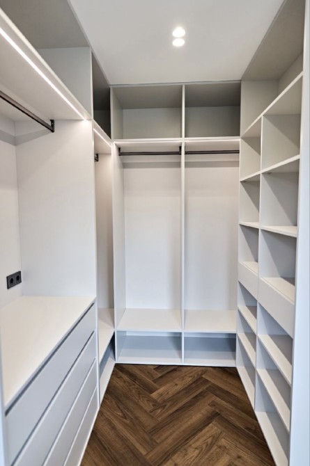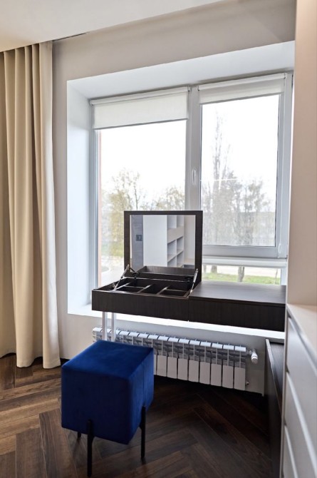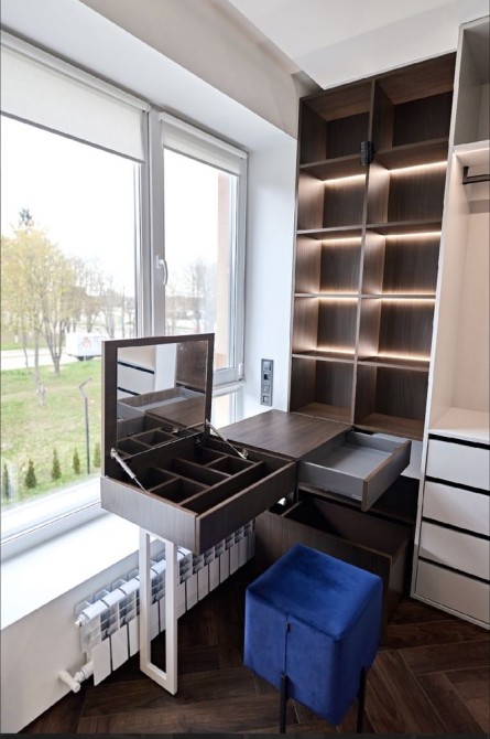 Велика гардеробна кімната, оснащена робочою зоною зі столиком, який трансформується у повноцінне місце для макіяжу