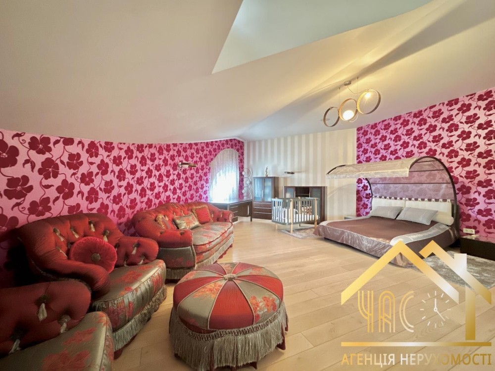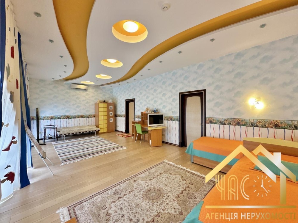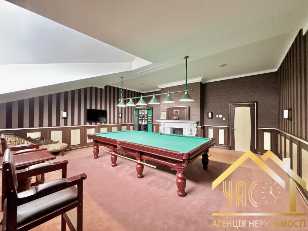 Функціональне планування: кухня з їдальнею, просторий зал із каміном, кабінет, майстер-спальня з гардеробною та власним санвузлом, велика дитяча кімната з можливістю поділу, більярдна зона з баром, тераса.