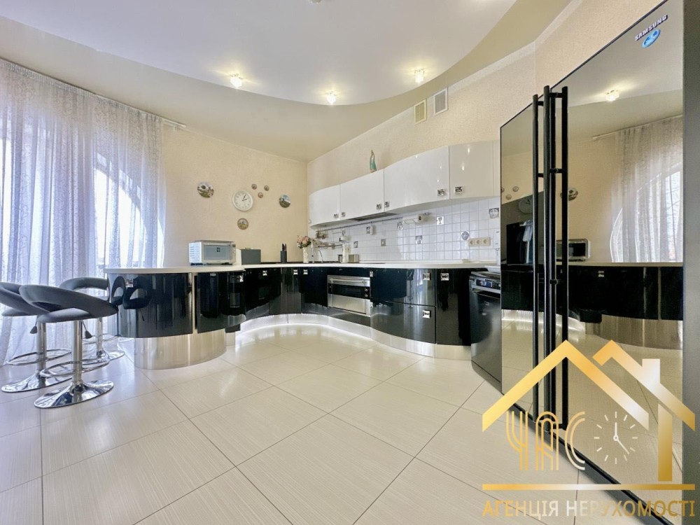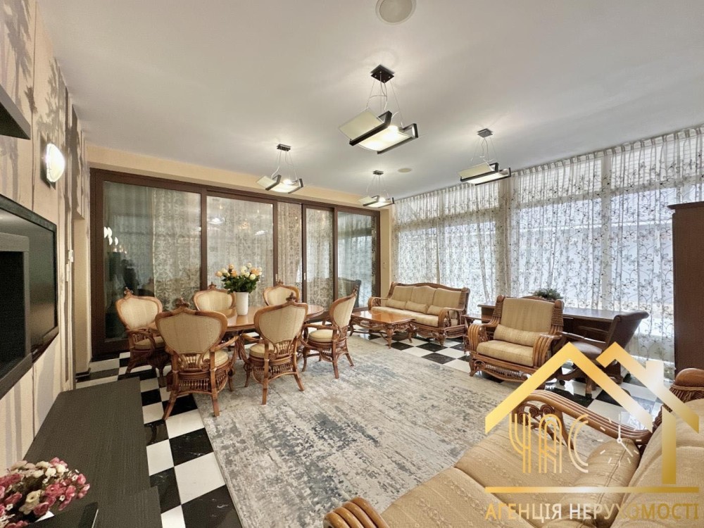 В оздобленні використані натуральні матеріали: морений дуб, американський горіх, італійська кухня та сантехніка, дерев’яні вікна. Два каміни.