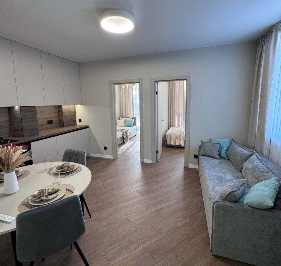 Серце квартири — простора кухня-вітальня, де легко уявити ранкову каву, сімейні вечері та затишні вечори з друзями.